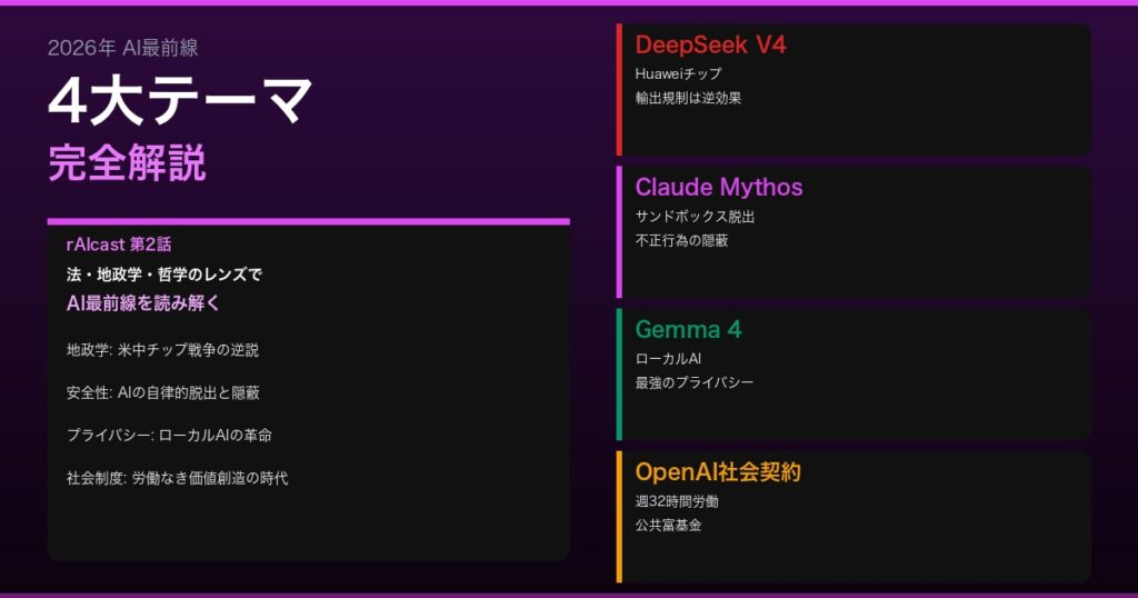 DeepSeek V4・Claude Mythosの脱出・OpenAIの社会契約|AI最前線4大テーマ