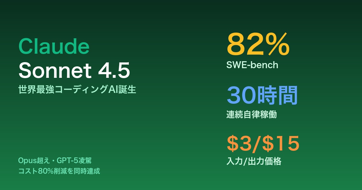 重要な転換点:Sonnet 4.5は、従来「Opusが最高性能」という常識を覆し、コーディング分野においてはSonnetがOpusを上回るという新しいパラダイムを確立しました。