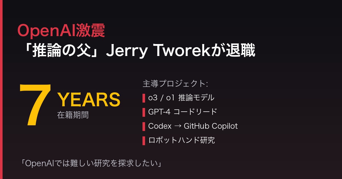2026年1月、AI業界に衝撃が走りました。OpenAIの研究副社長Jerry Tworek氏が、約7年間の在籍を経て退職することが明らかになりました。