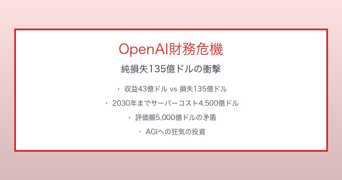 2025年9月30日、The Informationが入手したOpenAIの内部財務資料が、AI業界に衝撃を与えています。2025年上半期の収益は43億ドルと前年比16%成長を記録した一方で、純損失は135億ドルという破滅的な数字が明らかになりました。