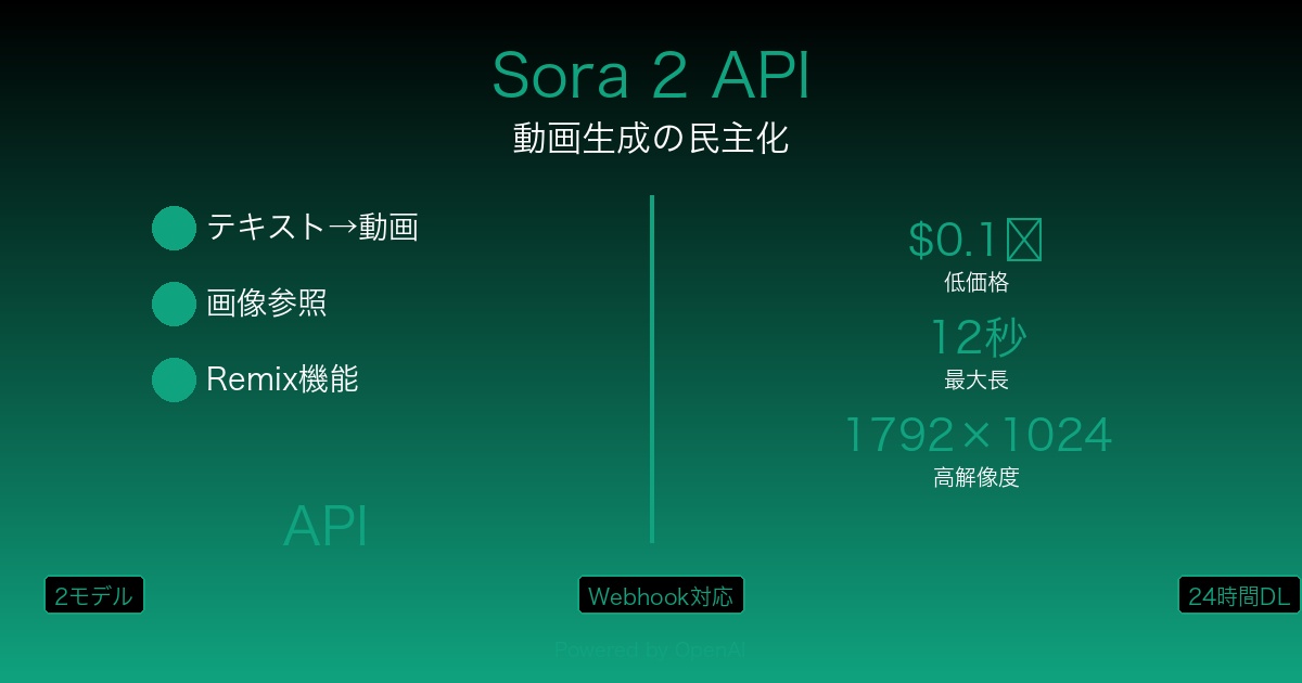 | 2025年10月 | Sora 2 API公開 | 開発者向けAPI |