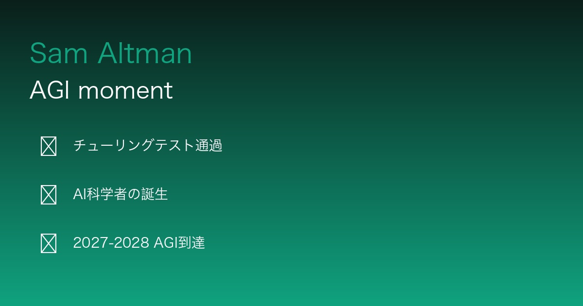 - もしSam Altmanが正しければ:GPT-5、GPT-6で段階的にAGI到達、2027-2028年が転換点