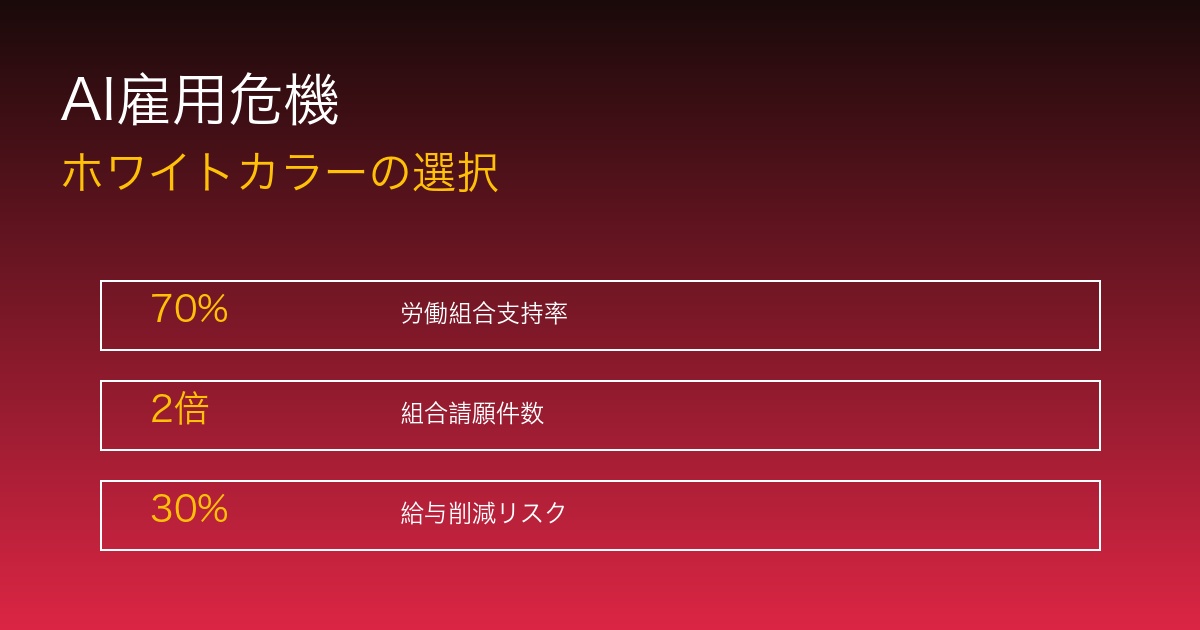 本記事では、 AIがもたらすホワイトカラー雇用危機の実態、労働組合への急速な回帰、そして給与25-30%削減という衝撃的な実例から、知識労働の未来を徹底分析します。