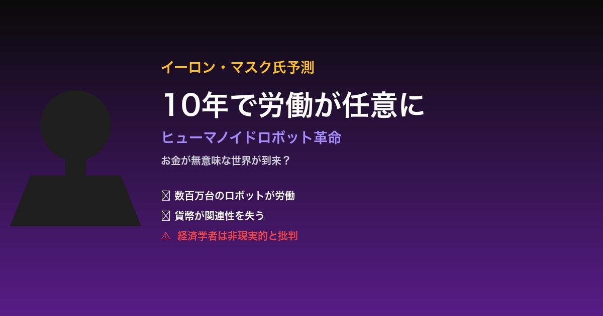 ヒューマノイドロボットと広範な自動化により、貨幣が関連性を失うかもしれない希少性のない世界(post-scarcity world)が生まれるという壮大なビジョン。しかし、経済学者たちは「タイムラインは非現実的」と厳しく批判しています。