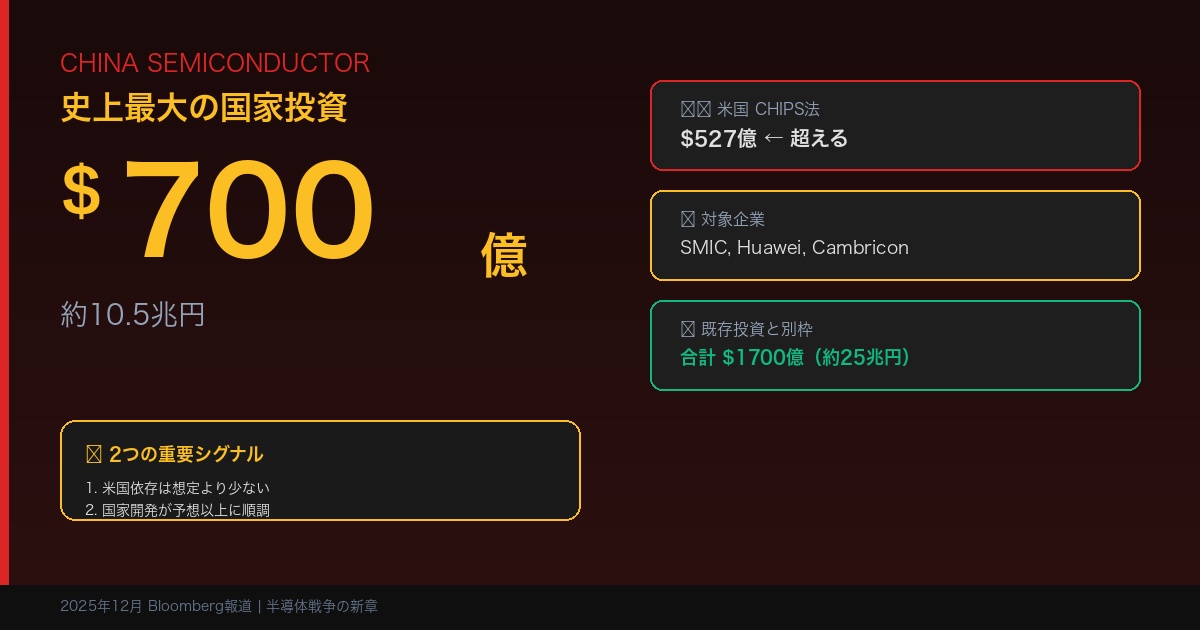 2025年12月12日、Bloombergは中国政府が半導体産業に最大700億ドル(約10.5兆円)の新たなインセンティブを検討していると報じました。これは、単一国家による半導体投資として史上最大規模となる可能性があります。