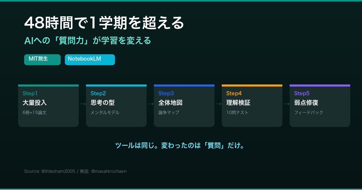 「賢い人はNotebookLMを『その分野の文献を全部読んだ家庭教師』として使っている。1学期と48時間の差は、コンテンツの量じゃない。どんな質問をするか、それだけだ。