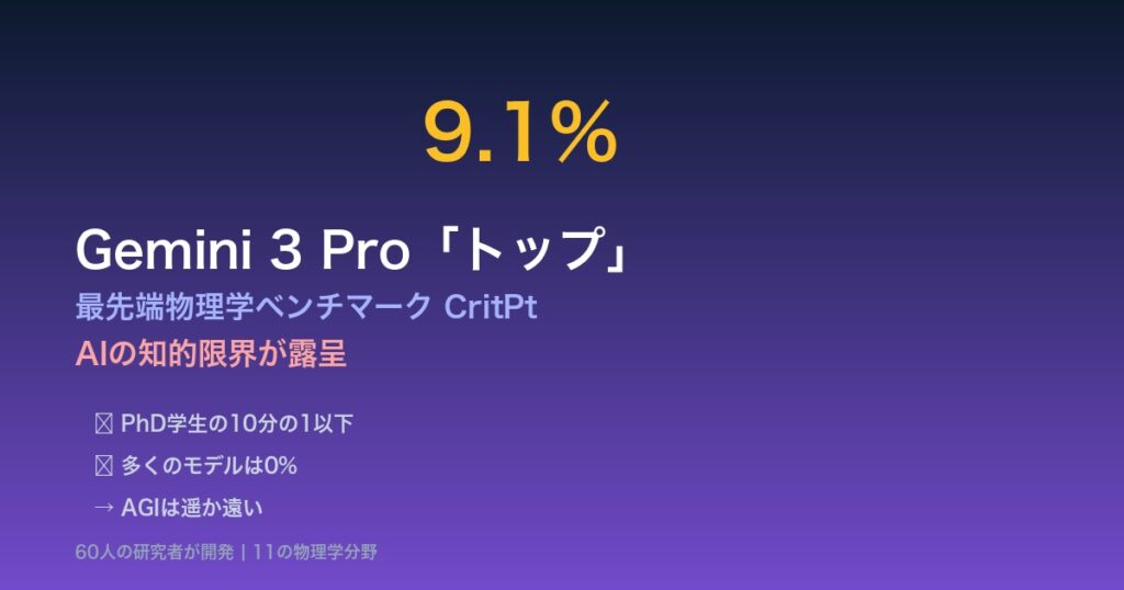 9.1%――これが、最先端AIモデルの「トップスコア」です。 Googleの最新Gemini 3.0 Pro Previewが、新しい物理学ベンチマーク「CritPt」で9.1%の正答率を記録し、全モデル中で最高得点を獲得しました。しかし、この数字は勝利ではなく、AIの深刻な限界を示し...