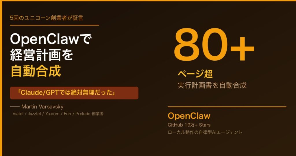 【5回ユニコーン創業者が証言】OpenClawで80ページ超の実行計画書を自動合成─Claude/GPTでは絶対無理だった