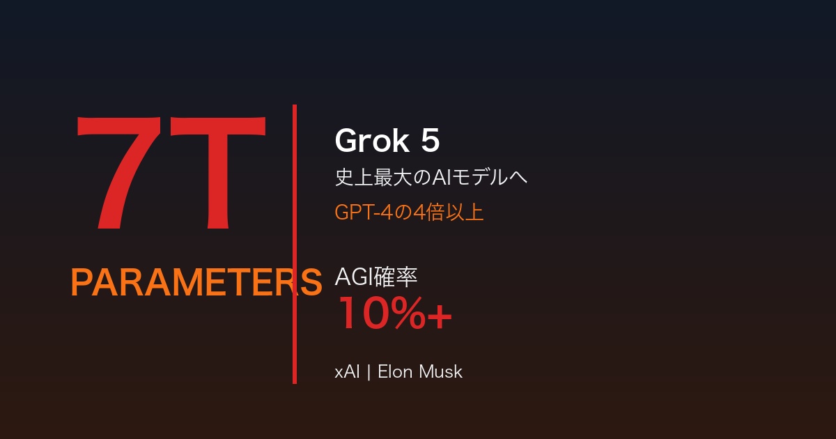 イーロン・マスク率いるxAIが、AI業界を震撼させる発表を行った。次期フラッグシップモデル「Grok 5」が7兆パラメータという史上最大規模で登場する見込みだ。