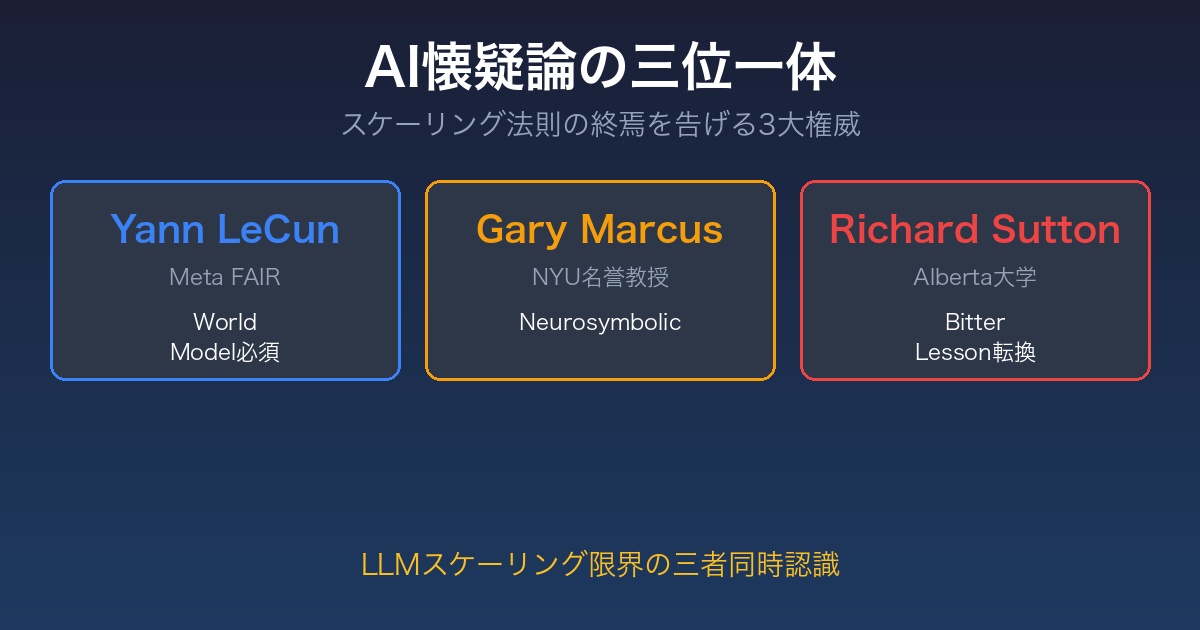 これにより、Yann LeCun、Gary Marcus、そしてRichard Suttonという「AI懐疑論の三位一体」が形成され、AGI達成への道筋が根本から問い直されています。