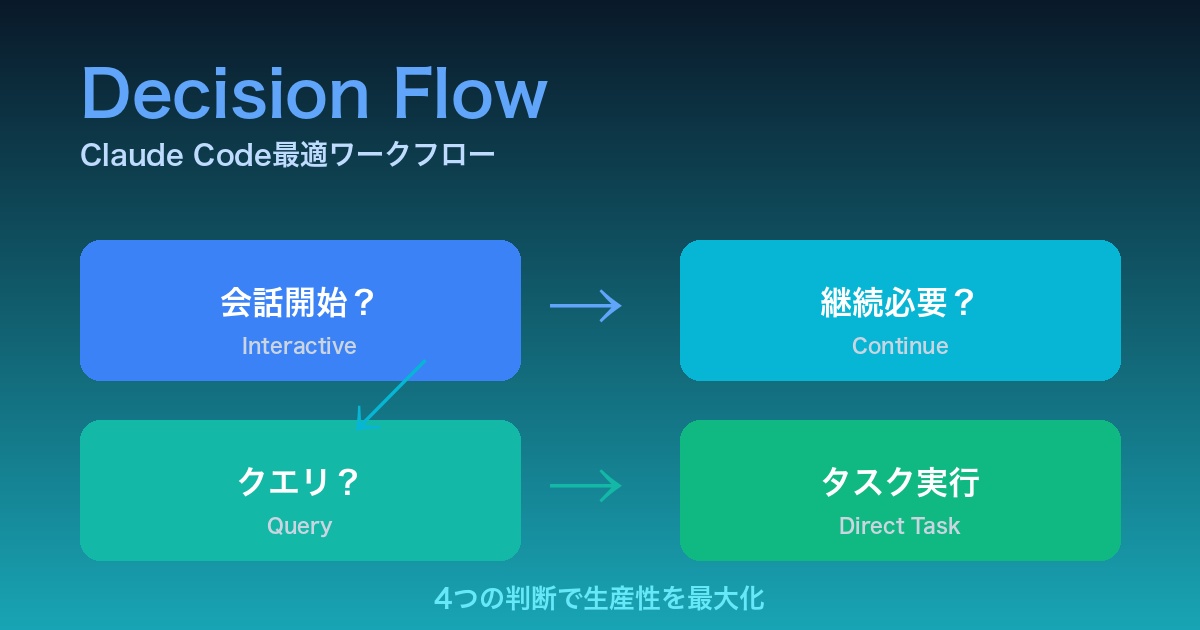 Claude Code Decision Flowは、以下の4つの質問に順番に答えることで、最適な実行モードを選択します: