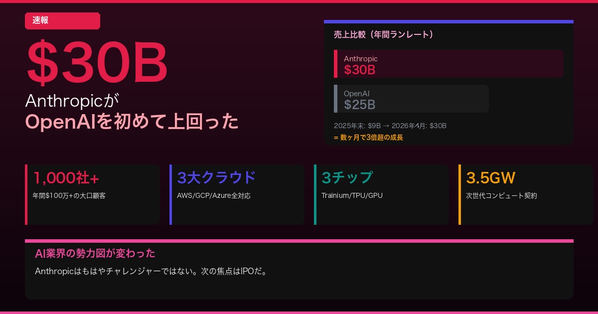 2026年4月7日、AnthropicがGoogleおよびBroadcomとの次世代コンピュートパートナーシップを発表した。同時に公開されたのが、年間ランレート売上$30B(約4.5兆円)という衝撃的な数字だ。2025年末の約$9Bからわずか数ヶ月で3倍以上に急成長し、OpenAIの$25Bを初めて上回った。