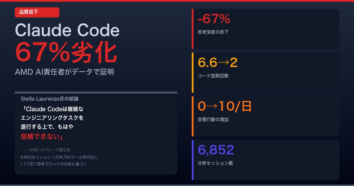 AMDのAIグループ責任者Stella Laurenzo氏が、Anthropicに対し異例の公開批判を行った。GitHubのIssueに投稿された内容は衝撃的だ──「Claude Codeは複雑なエンジニアリングタスクを遂行する上で、もはや信頼できない」。