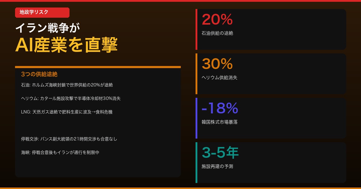 | ヘリウム30%消失 | 先端半導体の製造が制約され、GPU供給に影響 |
