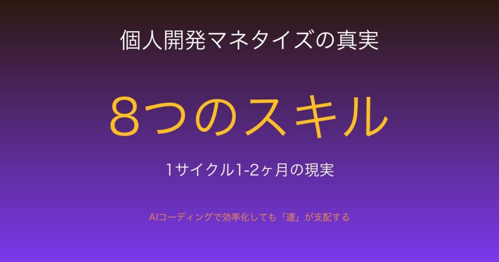【個人開発マネタイズの真実】8つの必須スキルと1サイクル1-2ヶ月の現実──AIコーディングで効率化しても「運」が支配する、数年かけて登る山の価値