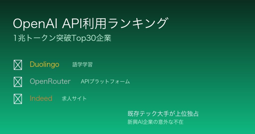 【1兆トークン突破】OpenAI API利用Top30企業ランキング──Duolingo首位の衝撃