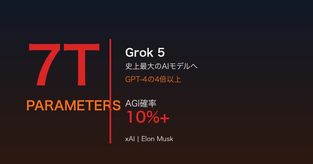 Grok 5とは何か?AI史上最大のモデルへの挑戦 イーロン・マスク率いるxAIが、AI業界を震撼させる発表を行った。次期フラッグシップモデル「Grok 5」が7兆パラメータという史上最大規模で登場する見込みだ。 "The next cutting-edge modelAs Elon already m...