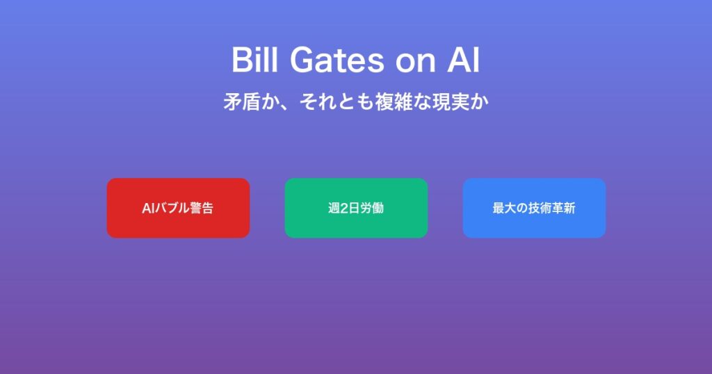 【ビル・ゲイツの矛盾】AIバブル警告と週2日労働の楽観論 – メディアの切り取りか、本当の矛盾か?冷静な分析