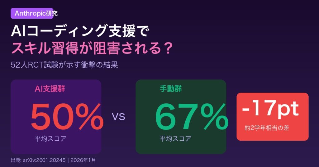 Anthropicが52人のエンジニアを対象にRCT(ランダム化比較試験)を実施。AI支援群は手動群より17ポイント低いスコアを記録し、約2学年相当のスキル差が発生。特にデバッグ能力の低下が顕著という衝撃の研究結果を解説。