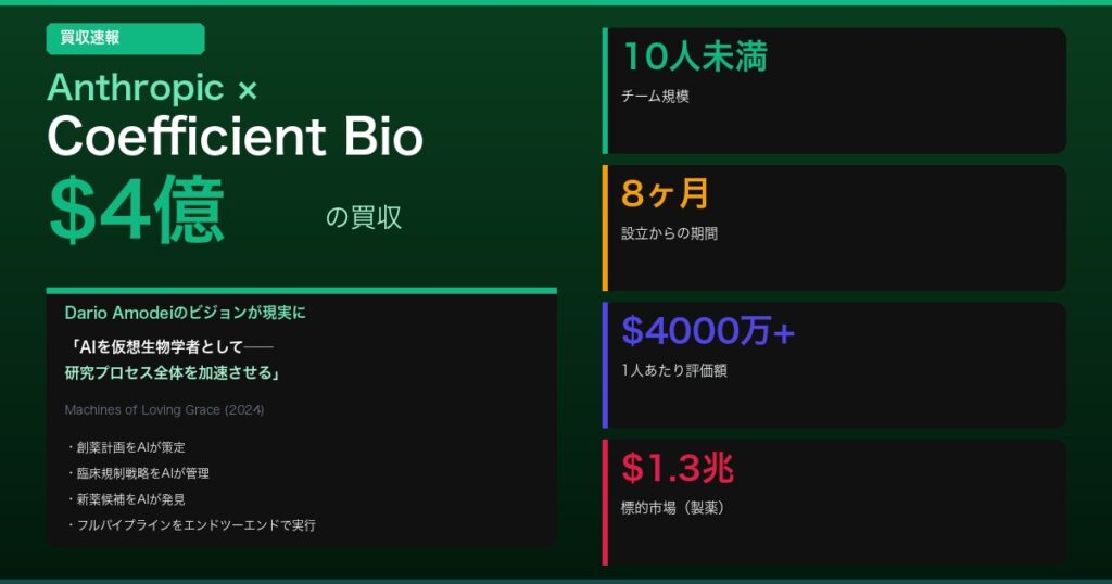 10人未満のスタートアップに4億ドル──何を買ったのか Anthropicが、ステルスモードのバイオテックAIスタートアップCoefficient Bioを約4億ドル(全額株式取引)で買収した。設立からわずか8ヶ月、従業員10人未満、公開製品なし──1人あたり4,000万ドル以上...
