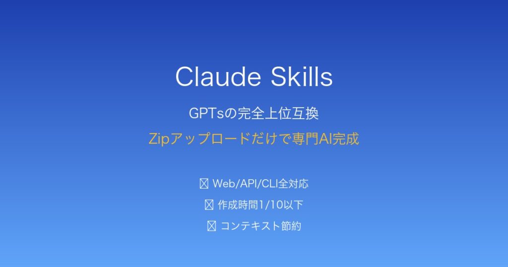 【Claude Skills完全ガイド】GPTsの完全上位互換──Zipアップロードだけで専門AI完成、API/CLI全対応でコンテキスト節約の革命